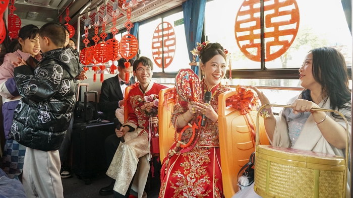 大紅喜字、結(jié)婚條幅、卡通婚紗照……這些喜慶的裝扮讓平日里“沉穩(wěn)”的公交車搖身一變,成為了新人的“幸福專列”。