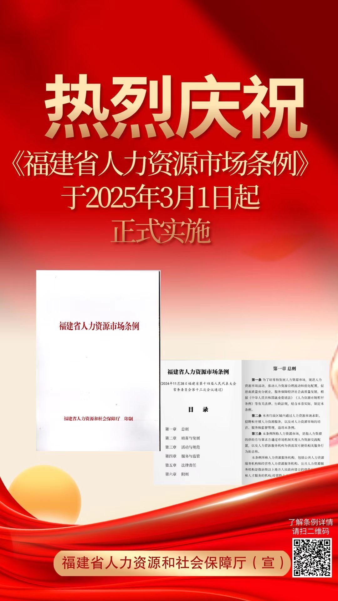 東南網3月1日訊(福建日報?新福建客戶端記者 趙文娟)記者從福建省人力資源和社會保障廳獲悉,《福建省人力資源市場條例》(以下簡稱“《條例》”)已由福建省第十四屆人民代表大會常務委員會第十三次會議于2024年11月28日通過,自2025年3月1日起施行。標志著福建人力資源市場建設邁入法治化、規范化、現代化發展的新階段。