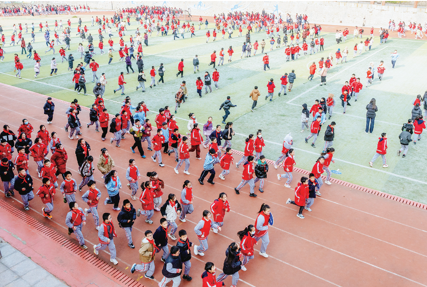 激昂的音樂奏響,學(xué)生在教師引導(dǎo)下,以班級為單位,一個個方隊開始跑動。他們身姿矯健、步伐輕盈,充滿活力。