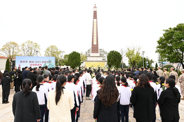清明祭英烈、鮮花寄哀思。清明前夕,漳州市廣泛組織開展“百園千校祭英烈”主題活動,廣大師生走進烈士陵園、革命紀念館等紅色教育基地,通過祭掃、獻花、宣誓等形式,表達對英烈的崇高敬意和深切追思。4月1日是《福建省烈士紀念設施保護管理辦法》實施當日,由中共漳州市委文明辦、漳州市退役軍人事務局主辦,中國共產主義青年團漳州市委員會、漳州市教育局、漳州軍分區政治工作處協辦,漳州市烈士紀念設施保護中心承辦的漳州市“賡續·2025·百園千校清明祭英烈”活動啟動儀式在市烈士陵園舉行,軍地代表200余人參加。
