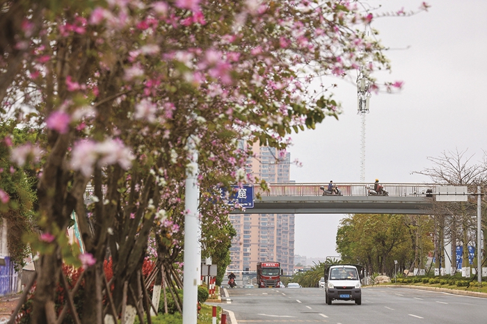 作為連接服裝城與摩天城的重要通道的石龍路,車流量巨大,人流密集。2023年5月,一座人行天橋在此落成,宛如一位優雅的舞者,以螺旋梯道與折返梯道交織出獨特的韻律。橋上的休閑坐凳與綠化小品,為人們提供片刻的寧靜與愜意。