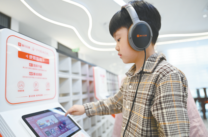 在實驗區圖書館,小朋友在選擇喜歡的有聲讀物。