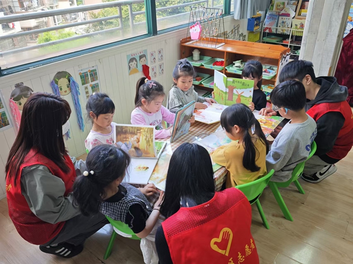 文明實踐志愿者與幼兒進(jìn)行一對一伴讀指導(dǎo),培養(yǎng)幼兒閱讀興趣(鳳嘉社區(qū)供圖)
