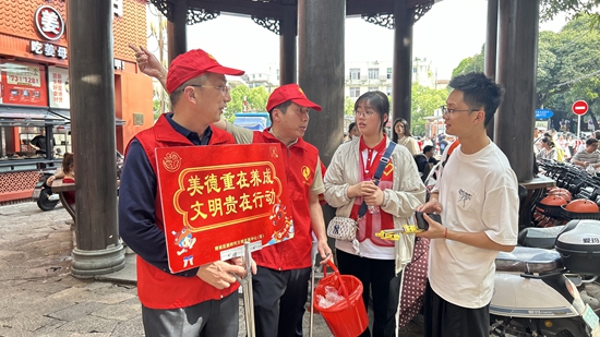 此次主題活動范圍覆蓋古城文脈實踐區(qū)全域,包括西街、花巷、文化宮、府文廟等4個文明實踐點,筍江公園、江南公園2個換乘中心,以及新華路、百源路、中山公園3個集散中心。在三朝巷等人流密集區(qū)域,“鄰里親·厝邊情”文明實踐志愿服務(wù)隊員們手持“美德重在養(yǎng)成 文明貴在行動”等標(biāo)語牌,通過彎腰撿拾垃圾、耐心解答疑問等實際行動讓八方游客感受到千年古城的魅力。在中山路附近,中保濟(jì)困公益慈善中心志愿者們則走進(jìn)店鋪,向商戶宣傳文明經(jīng)商、誠信經(jīng)營的理念。同時,對出店經(jīng)營、車輛亂停放等不文明現(xiàn)象進(jìn)行勸導(dǎo)護(hù)航古城文旅,共同營造安全、有序、溫馨的假日旅游環(huán)境。