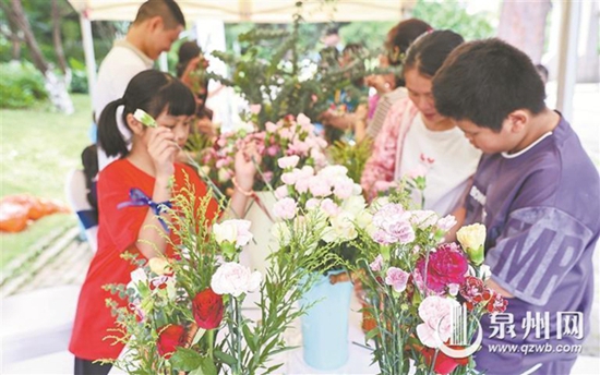 志愿者陪伴孤獨癥兒童進行插花游戲