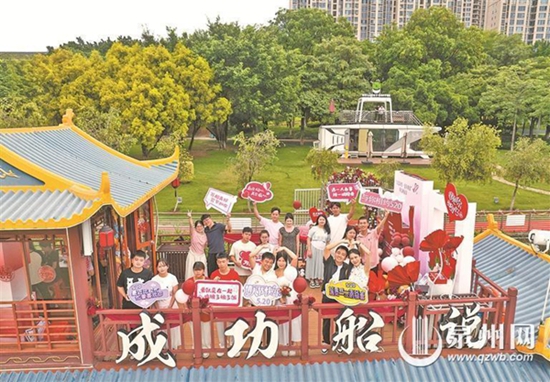 在南安武榮公園,9對新人在游船上參加集體頒證活動。