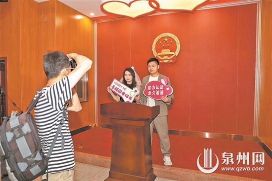 “520”諧音“我愛你”,美好的寓意讓不少新人選擇在這一天領(lǐng)取“紅本本”。隨著今年5月10日新修訂的《婚姻登記條例》正式施行,取消戶籍限制、無需提供戶口本的新政策,讓昨日成為婚姻登記“全國通辦”政策實(shí)施后的首個(gè)結(jié)婚登記高峰日。為滿足年輕人的儀式感,泉州市多個(gè)登記處也推出“花式服務(wù)”,為這個(gè)特殊日子增添更多甜蜜與便利。截至5月20日18時(shí),全市辦共理結(jié)婚登記1490對,較平時(shí)大幅度增加,其中180對非本地戶籍新人享受“全國通辦”政策便利。