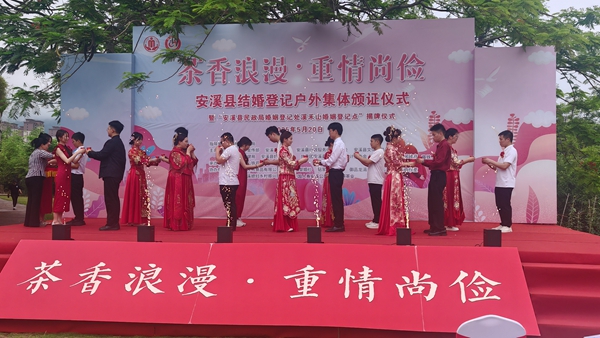 活動還舉行了“安溪縣民政局婚姻登記處溪禾山婚姻登記點、頒證點”揭牌儀式。據悉,安溪縣把首個戶外婚姻登記點、頒證點設在溪禾山鐵觀音文化園,旨在將婚姻登記服務和安溪婚俗文化、文旅資源相結合,打造一個“茶香浪漫”的領證場所,倡導“重情尚儉”的文明婚俗新風。(安溪縣融媒體中心記者 李文瑞 蘇雅彬)