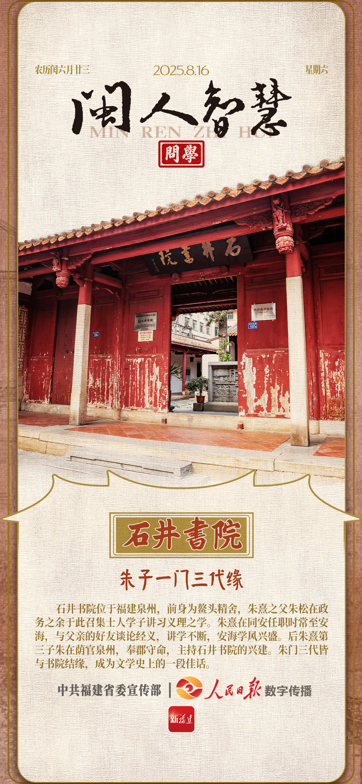 石井書院位于福建泉州,前身為鰲頭精舍,朱熹之父朱松在政務之余于此召集士人學子講習義理之學。朱熹在同安任職時常至安海,與父親的好友談論經義,講學不斷,安海學風興盛。后朱熹第三子朱在蔭官泉州,奉郡守命,主持石井書院的興建。朱門三代皆與書院結緣,成為文學史上的一段佳話。