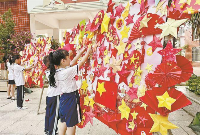 同安區朝陽幼兒園鋪開一幅百米長卷,大班幼兒們圍坐兩側,用畫筆共繪心中的祖國:巍峨的長城,騰飛的火箭……“孩子們把心中的祖國畫出來,這比說教來得直觀。”園方負責人說。在同安區新民中心小學的廣場上,一面由學生親手制作的“星墻”格外搶眼。大小不一的紅色、黃色五角星交錯排列,有的寫著“愿祖國繁榮昌盛”等真摯寄語。該小學相關負責人表示,這面“星墻”不僅展現了學生們的動手能力,更承載著新時代少年對國家的熱愛與對未來的憧憬。