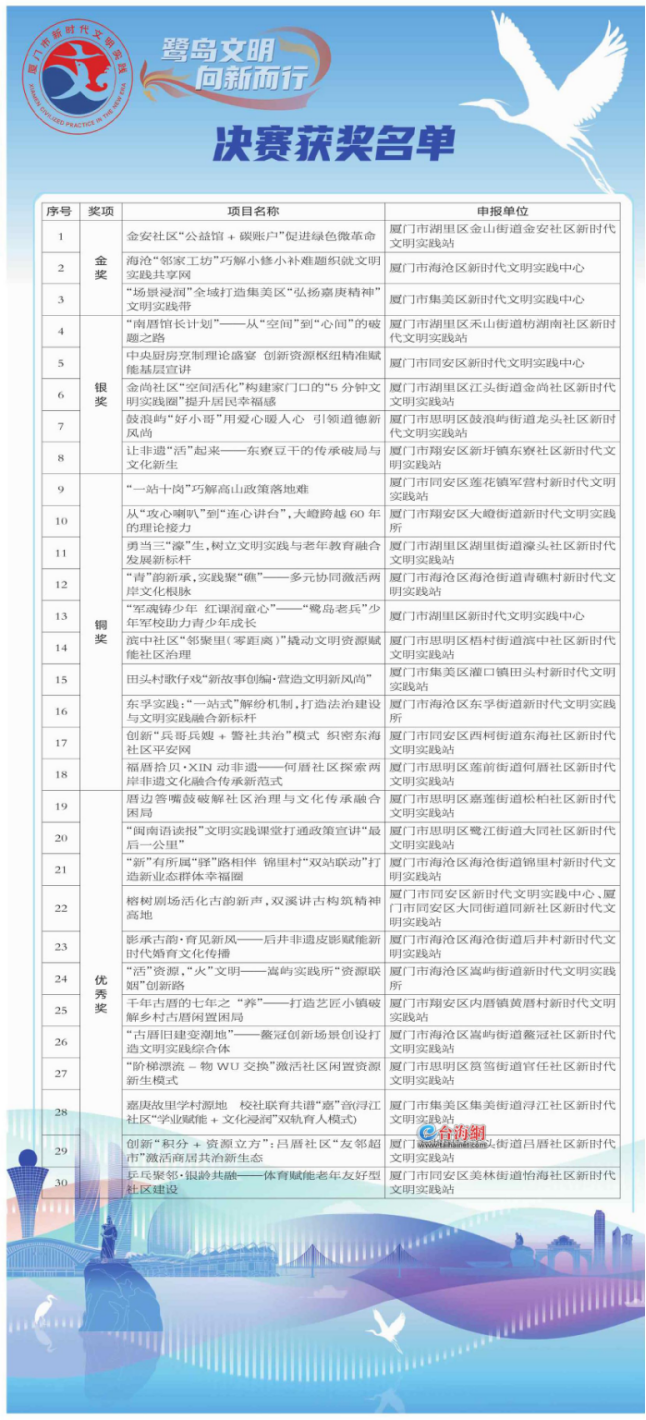 賽事已落幕,征程再出發。隨著一批批創新案例的落地推廣,文明實踐的種子將在鷺島大地繼續扎根生長,為這座文明之城注入更加持久的活力與動力。(廈門文明網 海峽導報記者 曾宇姍 余健平/文)