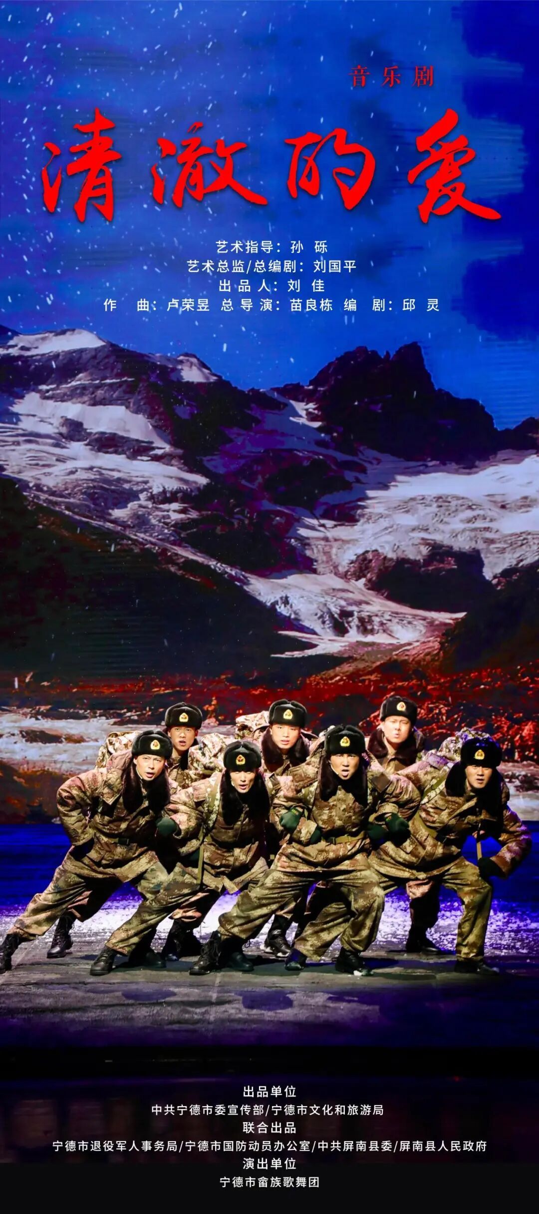音樂劇《清澈的愛》以閩東籍戍邊戰(zhàn)士陳祥榕為國(guó)犧牲的英雄事跡為背景,全劇分山谷、參軍、渡河、釀酒、熾志、勇敢六個(gè)篇章,展現(xiàn)了陳祥榕烈士從幸福安寧的故鄉(xiāng)閩東到條件艱苦的喀喇昆侖邊關(guān),從意氣風(fēng)發(fā)的少年到手握鋼槍的戍邊戰(zhàn)士,寧灑熱血、不失寸土,最后與戰(zhàn)友們?cè)诩永杖f河谷浴血奮戰(zhàn),用生命踐行“清澈的愛,只為中國(guó)”的英勇事跡。全劇時(shí)長(zhǎng)約70分鐘,以音樂劇的形式,弘揚(yáng)新時(shí)代英雄的家國(guó)情懷,用歌聲講述少年英雄的成長(zhǎng)足跡,用旋律深情歌頌“新時(shí)代衛(wèi)國(guó)戍邊英雄群體”,激勵(lì)廣大青少年矢志奮斗。