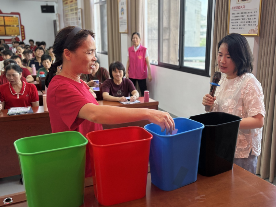許連鳳號召婦女姐妹發揮獨特作用,帶領家庭爭當垃圾分類宣傳者、實踐者。鄭雨琳結合專業背景與志愿服務經驗,生動講解四類垃圾精準投放要點及環保意義。活動還設置了趣味垃圾分類小游戲,吸引眾多家庭參與,寓教于樂鞏固知識。