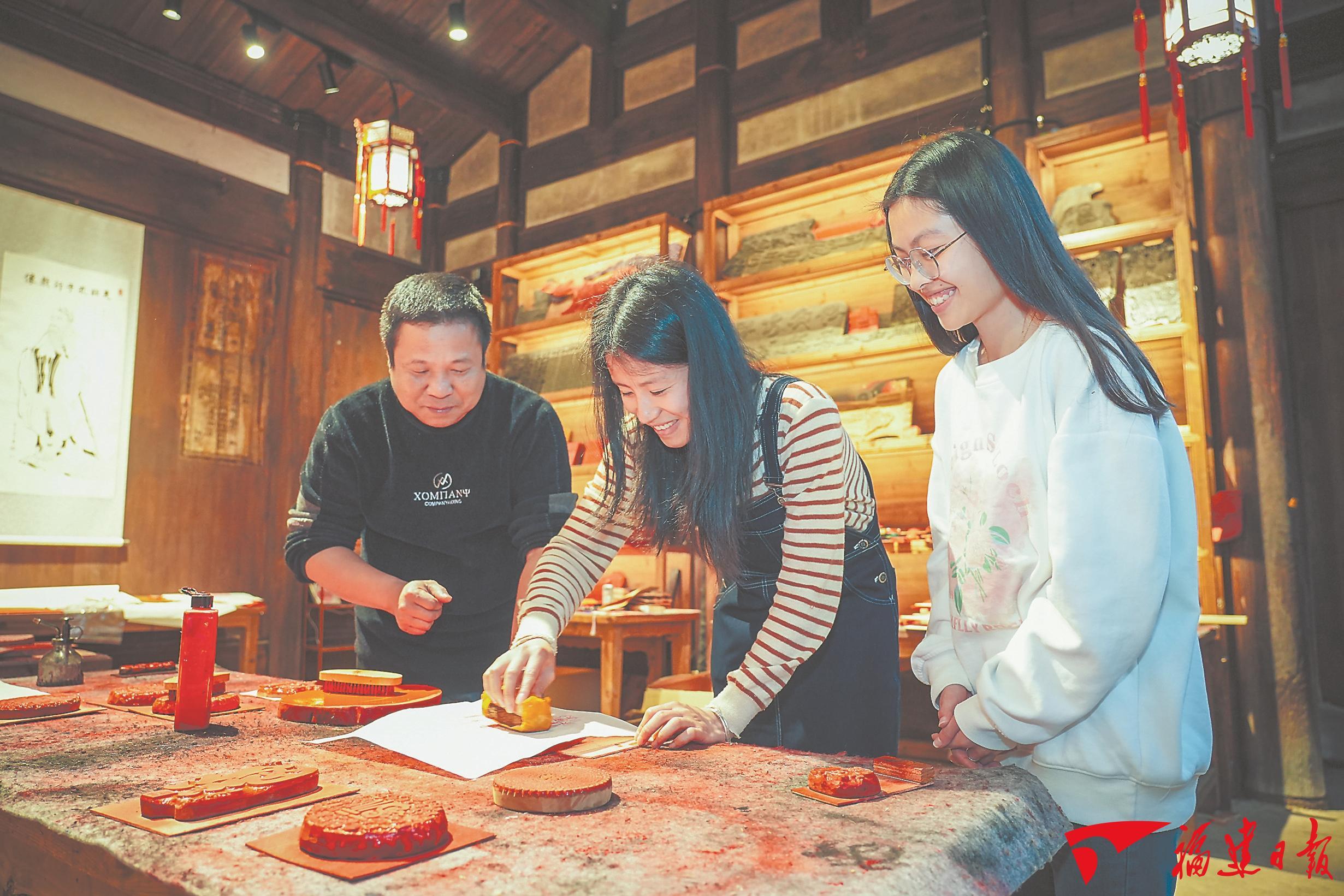 游客在連城四堡體驗雕版印刷技藝。章宸睿 攝