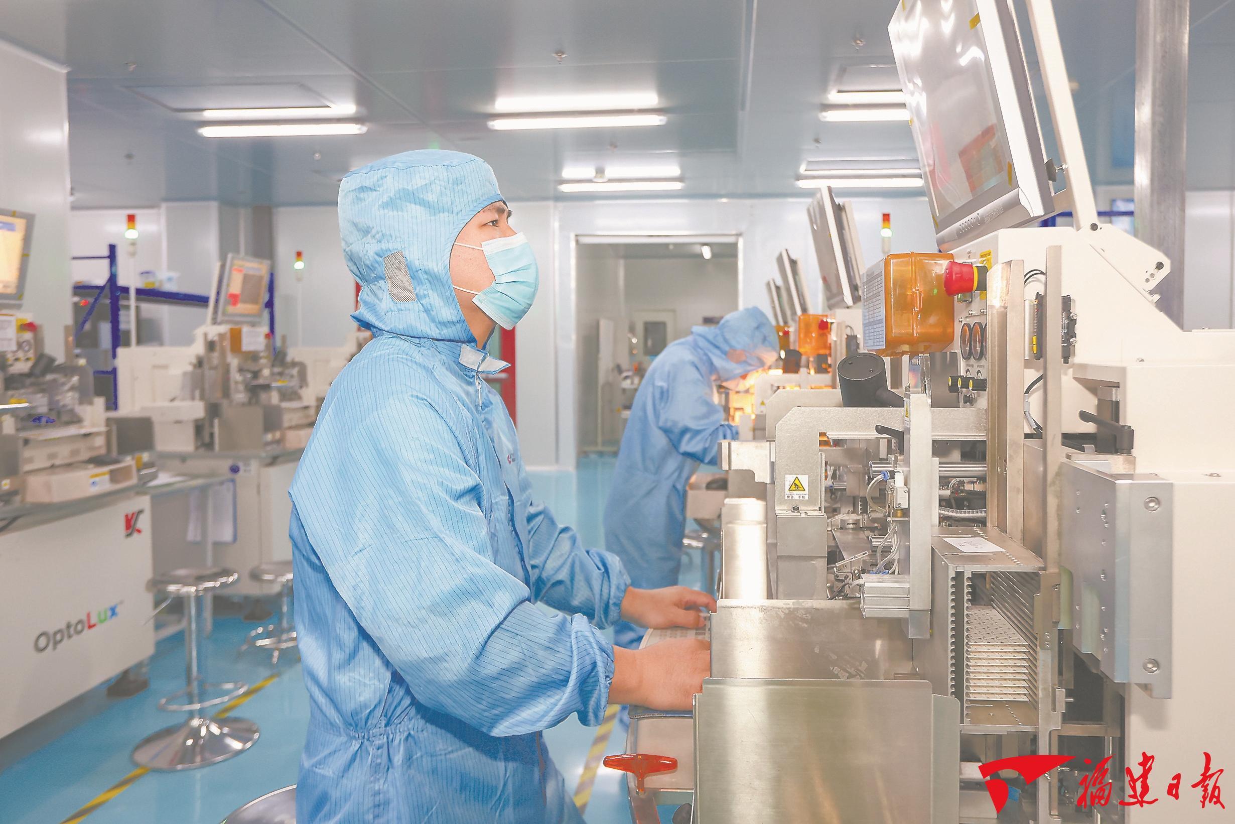 福建晶旭半導體科技有限公司生產車間內,工人在進行焊線操作。 謝澤鏵 攝