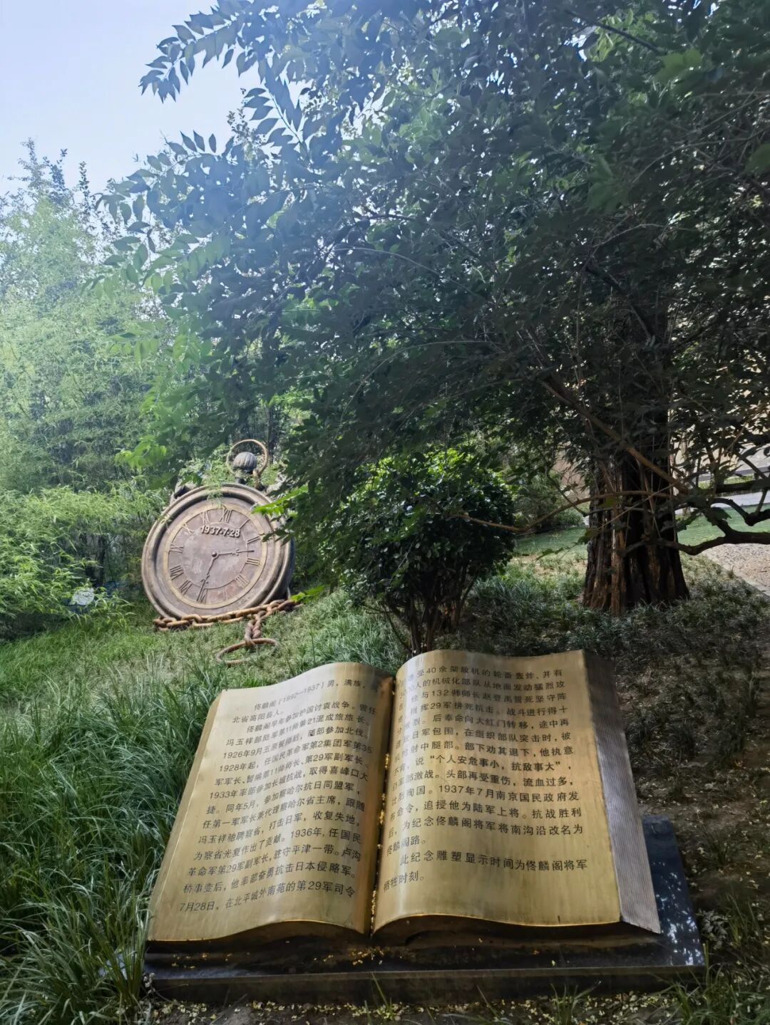7月6日在北京佟麟閣路拍攝的懷表和書本雕塑。懷表上的時間,停留在佟麟閣將軍為國捐軀時刻,書本上記錄了佟麟閣將軍殉國經過。