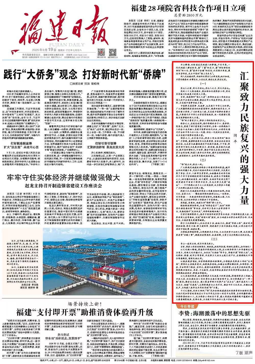 千川匯海闊,風好正揚帆!“僑”是加快新福建建設的重要資源和獨特優勢。讓我們更加緊密地團結在以習近平同志為核心的黨中央周圍,當好閩籍僑胞和歸僑僑眷的貼心人,成為僑務工作的實干家,最大限度把閩籍僑胞中蘊藏的巨大能量凝聚起來、發揮出來,為實現中華民族偉大復興貢獻力量。
