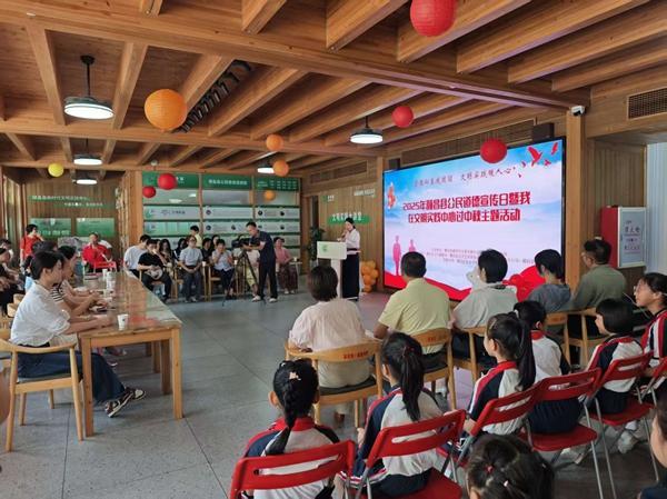 現場還舉行了莊嚴的新時代文明實踐志愿服務隊授旗儀式以及多個游園體驗區,吸引眾多市民駐足參與。在非遺展示區,大家領取繪制中秋主題團扇,體驗傳統文化的魅力;“道德知多少”有獎競猜區市民們踴躍答題,在互動中加深對道德知識的理解;“家風潤德”明信片寄語區則成為不少家庭表達情感、傳遞溫暖的平臺;志愿服務區的健康義診服務為市民提供切實幫助;“文明行為我承諾”簽名墻上寫滿了名字,表達了大家踐行文明、傳播美德的共同意愿。“今天帶孩子來參加這個公民道德宣傳日活動,真的感覺非常有意義。活動很豐富多彩,我們在里面聽了道德模范的事跡分享,給我們帶來了很多感悟。在外面活動區還猜了燈謎,還收到了家風明信片,真的對我們教育孩子,以后樹立一個良好家風都有很好的幫助。”市民林女士在活動現在向大家分享游園體會。