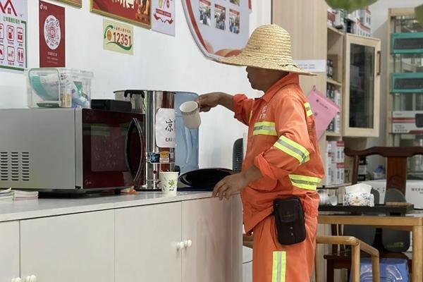 在城關鎮解放路,環衛工人林美妹清掃完街道后,如往常一般走進世佳辦公服務商行,倒了杯茶解渴。“以前看店里這么干凈,我都不敢進來,現在就像到自己家。我還常跟店主說‘多煮點魚腥草涼茶,消暑’。”林美妹笑道。