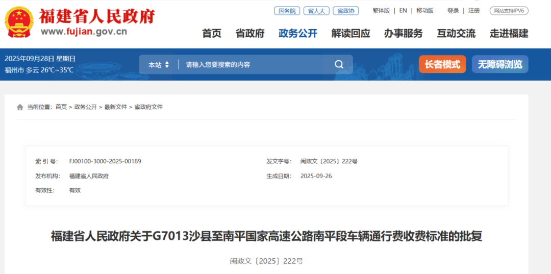 你們《關于呈請批準G7013沙縣至南平國家高速公路南平段車輛通行費收費標準的請示》(閩交規〔2025〕42號)收悉。經研究,同意你們關于G7013沙縣至南平國家高速公路南平段車輛通行費收費標準的意見,即客車基本費率按小型車(一類客車)0.60元/車公里計算,貨車及專項作業車基本費率按小型車(一類貨車)0.45元/車公里計算。