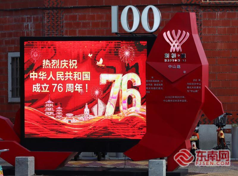 市區LED屏滾動播放“熱烈慶祝中華人民共和國成立76周年”的標語。東南網記者林婕 攝