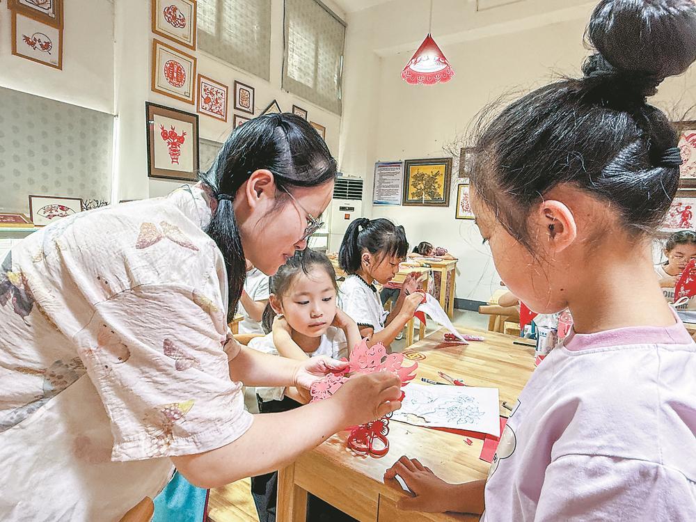 非遺代表性傳承人陳水云(左一)指導學生練習剪紙。