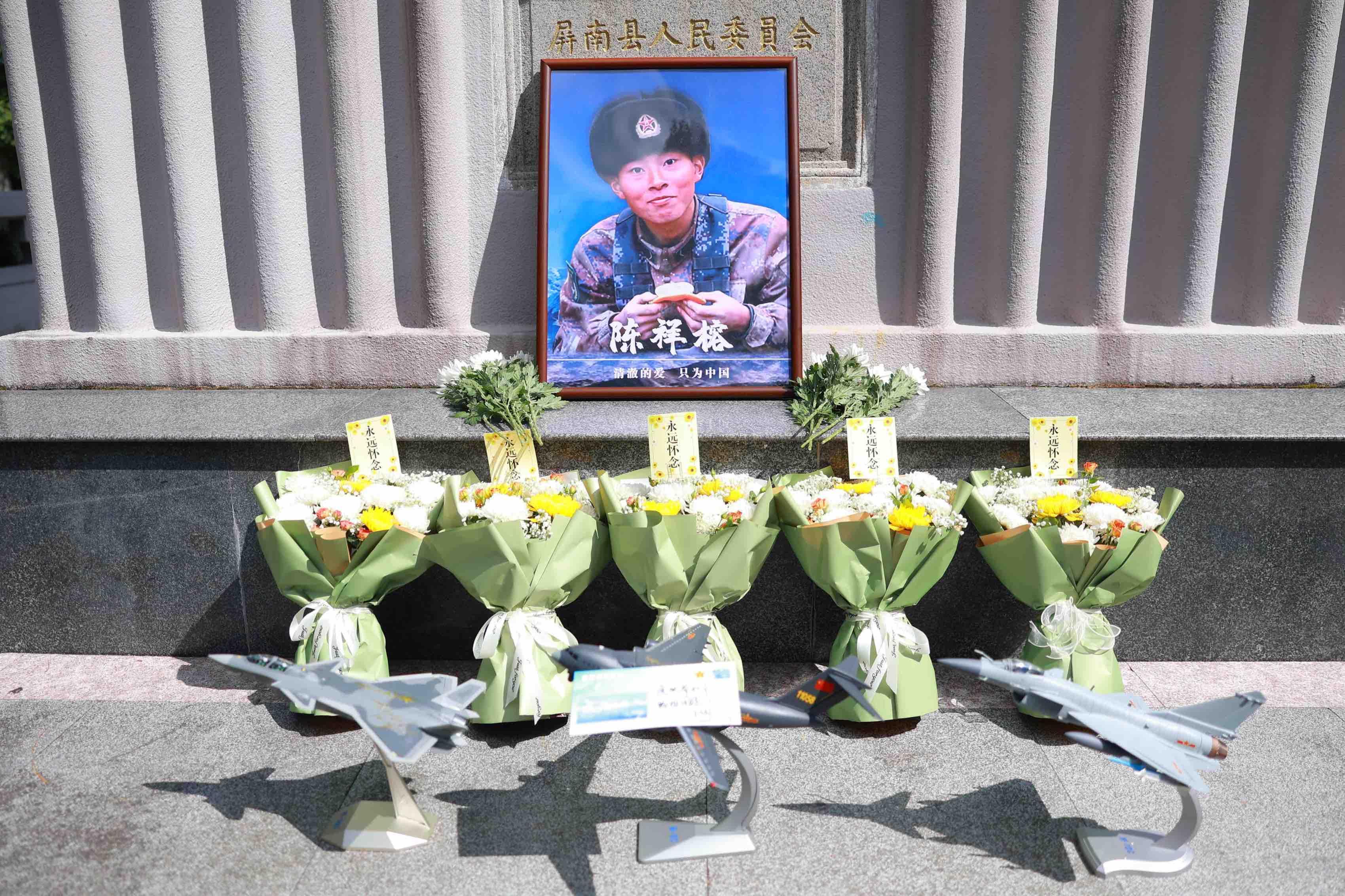 上午10時,屏南縣革命烈士陵園內莊嚴肅穆。參與人員身著正裝、有序列隊,向長眠于此的陳祥榕烈士敬獻花束,并默哀致敬,表達對英雄烈士的無盡懷念與崇高敬意。隨后,中國公共關系協會國防教育專家、中國空軍首任新聞發言人申進科將“11058”號運—20、殲—10C、殲—20三架戰機模型,鄭重擺放至陳祥榕烈士遺像前——這三架模型不僅是中國空軍力量的象征,更代表著對烈士“保家衛國”初心的致敬,讓英雄的精神與家國的力量緊緊相連。
