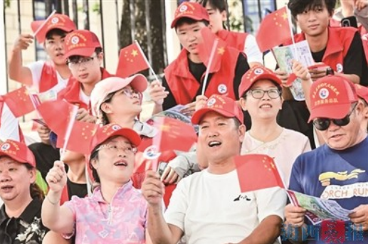 南薰樓外,百名群眾揮舞國旗唱響《歌唱祖國》。