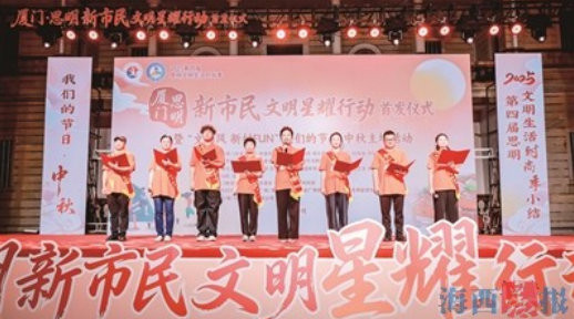 9月26日,廈門·思明新市民文明星耀行動首發儀式暨“文明風 新村FUN”我們的節日·中秋主場活動在塔頭社舉行,廈門?思明新市民文明星耀行動正式首發。“星耀”寓意希望、照亮與前行,思明區全新打造“1+5+N”模式,即以廈門·思明新市民文明星耀行動為主軸,推出“文明合伙人”“文明體驗營”“文明城市行”“文明星光說”“文明我代言”等五項專屬計劃,打造N個以新市民個性化需求形成的立體多元項目。
