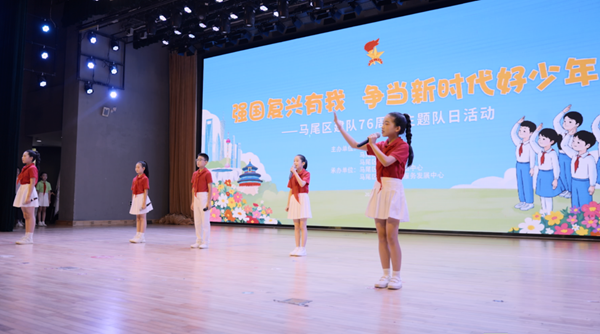 整場活動由兩位優(yōu)秀少先隊員主持,他們沉穩(wěn)自信、配合流暢,展現(xiàn)出馬尾區(qū)少年兒童良好的綜合素質(zhì)與精神面貌。活動在鏗鏘有力的集體朗誦《中國紅》中拉開序幕。來自區(qū)青少年活動中心的少先隊員們精神飽滿、情感真摯,將愛國主義情感與對少先隊組織的認同融入朗誦之中,不僅營造出莊重?zé)崃业默F(xiàn)場氛圍,也進一步激發(fā)了在場少年兒童傳承紅色基因的自覺與決心。隨后進行的出旗儀式上,全體人員肅立行禮,注視隊旗,齊唱隊歌。莊嚴(yán)的儀式進一步增強了少先隊員的組織歸屬感和集體榮譽感,也使他們在沉浸體驗中強化了身份認同和責(zé)任意識。