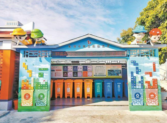 在海滄區(qū)嵩嶼街道貞庵村,垃圾分類屋則兼具功能性與辨識(shí)度。村莊主入口處,一座藍(lán)綠相間的“卡通垃圾分類屋”格外引人注目,“藍(lán)爸爸”“綠姐姐”“紅寶寶”“黃媽媽”四組卡通IP形象分別對(duì)應(yīng)可回收物、廚余垃圾、有害垃圾和其他垃圾,既清晰指引分類,又成為村莊環(huán)保宣傳地標(biāo)。居民李大姐笑著說(shuō),卡通形象讓分類指引更易記憶,村里孩子們尤其感興趣,“先認(rèn)‘角色’再認(rèn)垃圾,記得可快了!”