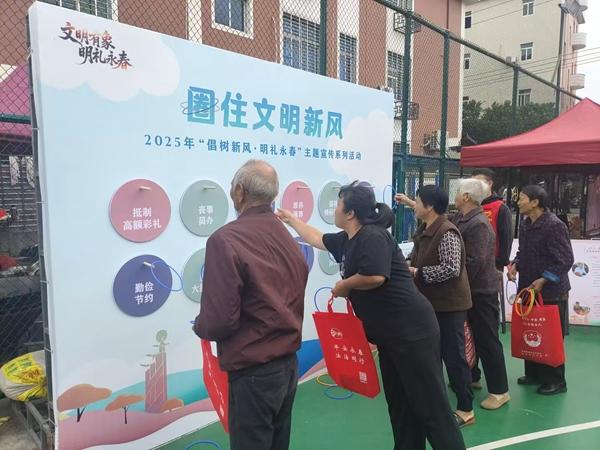 當天,活動現場還同步設置了面向老年朋友的文明實踐服務集市,涵蓋移風易俗宣傳、適老政策宣傳、義診、義剪等多個板塊。其中,在“倡樹新風?明禮永春”移風易俗行動宣傳區,借助“圈”出文明新風互動小游戲、文明殯葬倡議書展板等形式,向老年人普及移風易俗知識,發揮老年群體對家庭和子女的教化示范作用;在“好人永春”道德典型事跡展區,以圖文形式講述永春縣孝老愛親、敬業奉獻、助人為樂等道德典型事跡,以“身邊事”傳遞“向善力量”。