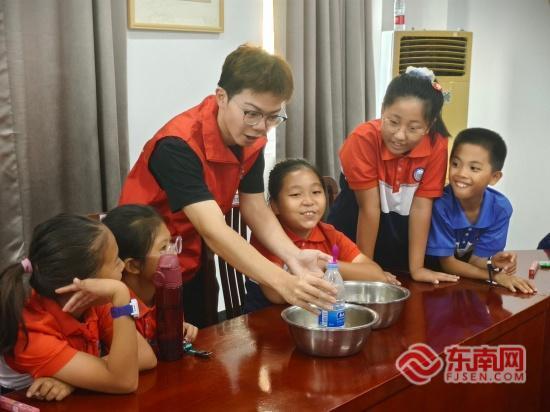 華僑大學信息科學與工程學院“星光筑夢”服務隊帶領社區小朋友做實驗 。新村社區新時代文明實踐站 供圖