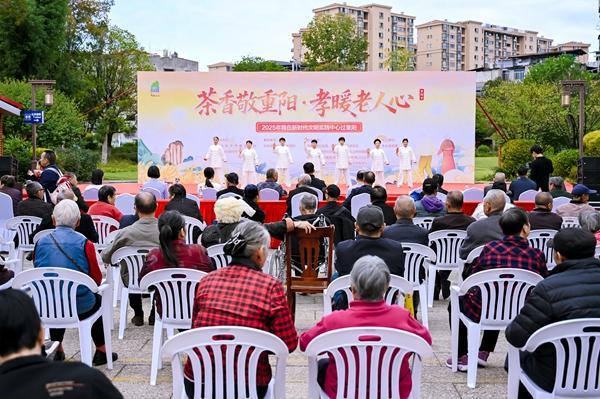 活動現場內容豐富、精彩紛呈。茶藝師展示了行云流水的武夷茶藝,青少年代表向長者奉上孝心茶,傳遞濃濃敬老情。文藝表演環節匯聚了漢樂舞、廣場舞以及《時間都去哪兒》等經典歌曲演唱,老年團隊還帶來了太極等節目,展現了老年生活的活力與風采。期間還穿插了重陽知識與武夷文化有獎問答,現場老人們踴躍參與,笑聲掌聲不斷。便民服務區同樣人氣高漲,健康檢測、愛心義剪、防詐宣傳、智慧助老等服務貼近需求,老人們還可領取長壽面、茱萸香囊等節日禮品,品嘗千層糕、“鳳凰蛋”茶飲等特色美食,切實感受到社會的關懷與溫暖。