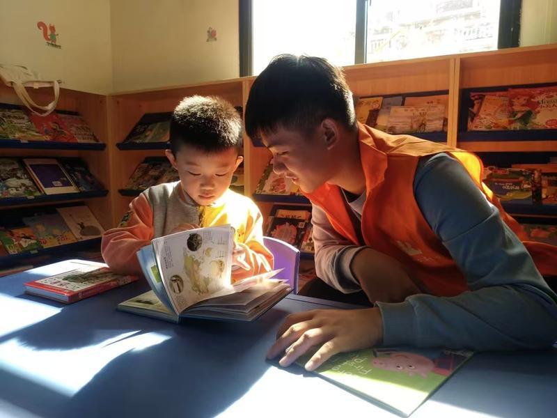 福州大學霞舒公益實踐隊隊員和小朋友一起閱讀。