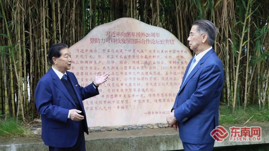 “菌草之父”林占熺向謝西蒙介紹菌草援外情況。