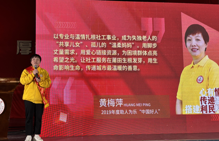 2019年度助人為樂“中國好人”黃梅萍,作為涵江區助涵社會工作服務中心理事長,長期運用專業社會工作方法服務弱勢群體,用實際行動詮釋了“贈人玫瑰,手留余香”的奉獻精神。