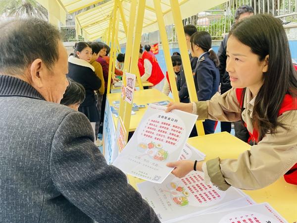 新風宣傳區,文明出行、垃圾分類、文明養寵、移風易俗等主題宣傳臺一字排開。交警現場講解交通安全知識,垃圾分類宣傳員組織趣味游戲,文明養寵臺發放宣傳手冊,倡導居民牽好“文明繩”、及時清理寵物糞便,移風易俗宣傳員則結合本地習俗,倡導婚事新辦、喪事簡辦,弘揚時代新風。