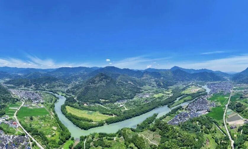 航拍視角下,霍童溪如翡翠玉帶蜿蜒于青山綠野間,串起錯落古村,盡展閩東山水的靈秀之美。寧德文明網供圖