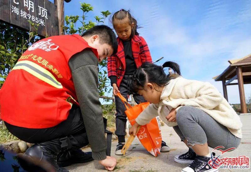 志愿者為孩子們介紹“大地美容”的活動,是一場為大地母親美容,凈化自我心靈的行為藝術。志愿者與孩子們一邊呼吸清新的空氣、欣賞美景,一邊將游客丟棄的煙頭、紙屑、飲料瓶、食品包裝袋等垃圾撿起放入垃圾袋。