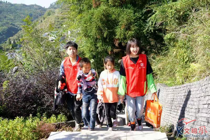重陽節,志愿者帶領孩子們為村里的老人送溫暖。劉永伙 攝
