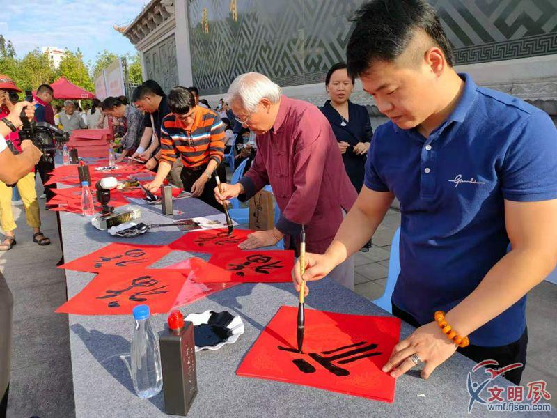 一邊是載歌載舞的舞臺表演,另一邊則是濃郁墨香的書畫助學現場。仁慈法師、林志良、葉曼林、羅鐘、嚴宗珍、曹原彰、黃文杰、黃亞彬、王玉麟、陳秀英、葉葆重等來自海峽兩岸的11位書法名家,揮毫潑墨,手寫勸學勵志楹聯或福字,為廣大市民送祝福。