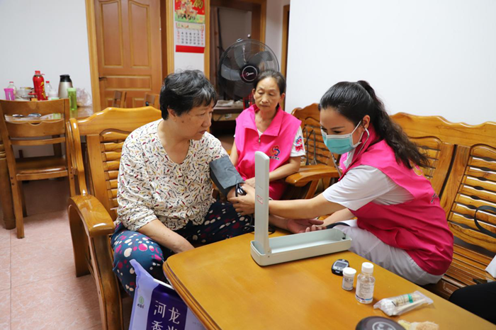 2021年10月13日,“近鄰·愛心敲敲門”巾幗志愿者上門為三元區東安社區困難老人測量血壓,提供健康指導服務。