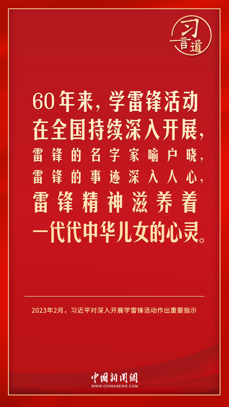 今年是毛澤東等老一輩革命家為雷鋒同志題詞60周年。黨的十八大以來,習近平總書記就學習弘揚雷鋒精神多次作出重要指示,他強調,無論時代如何變遷,雷鋒精神永不過時。