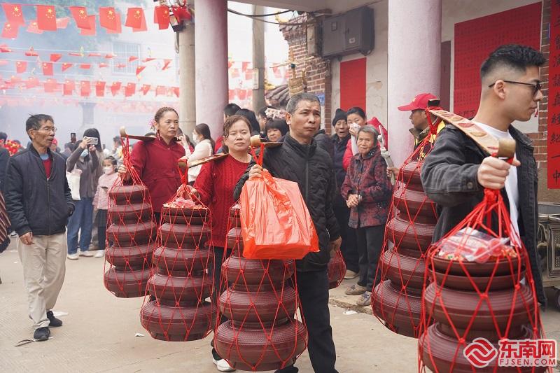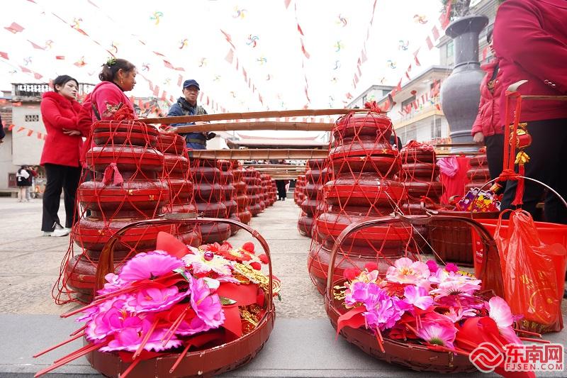 現場人流如潮、熱鬧非凡。當天,儀式結束后,由“福首”帶領族群,挑著盤擔巡街出游,“福首”手捧鮮花和香爐,沿路百姓圍繞福首,換香求福,祈求國泰民安。“福首”被視為族群中最有福氣的人,從村里各姓氏中,按年齡安排德高望重的人擔任。而十盤擔則是莆田規格最高的賀禮,一擔十盤,從大到小,葷素裝盤,甘蔗隨擔,寓意十全十美、甜蜜和合。