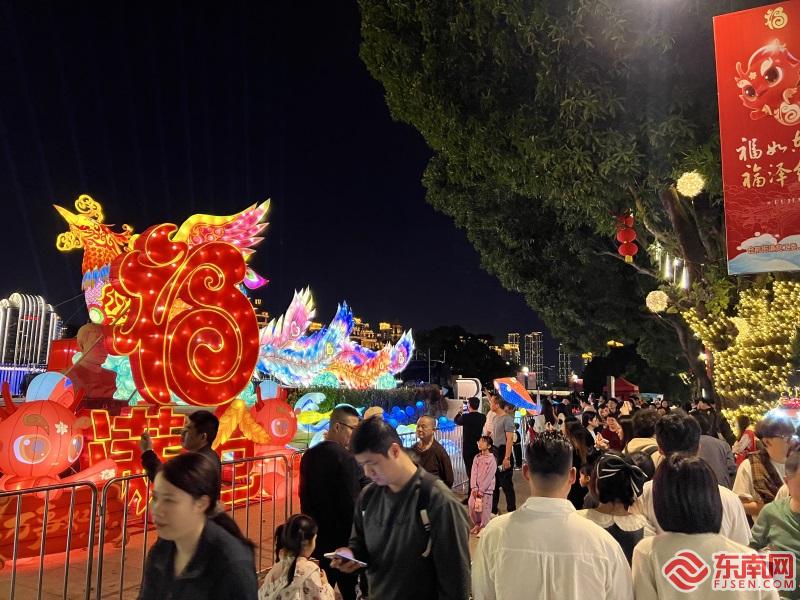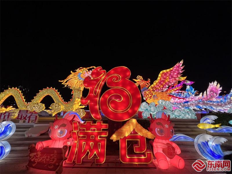 福州倉前公園設置了“龍鳳呈祥”燈組,由長約20米、高約8米的龍燈和鳳燈組成。記者看到,璀璨的金龍彩鳳燈相對而望,中間是“福滿倉”三個大字,寓意“龍鳳呈祥,倉山有愛”。沿臺階還布置了鯉魚燈,燈組龍嘴緩緩噴霧,龍頭輕輕擺動,好似在浪花中穿行,猶如再現,鯉魚躍龍門的生動場景。