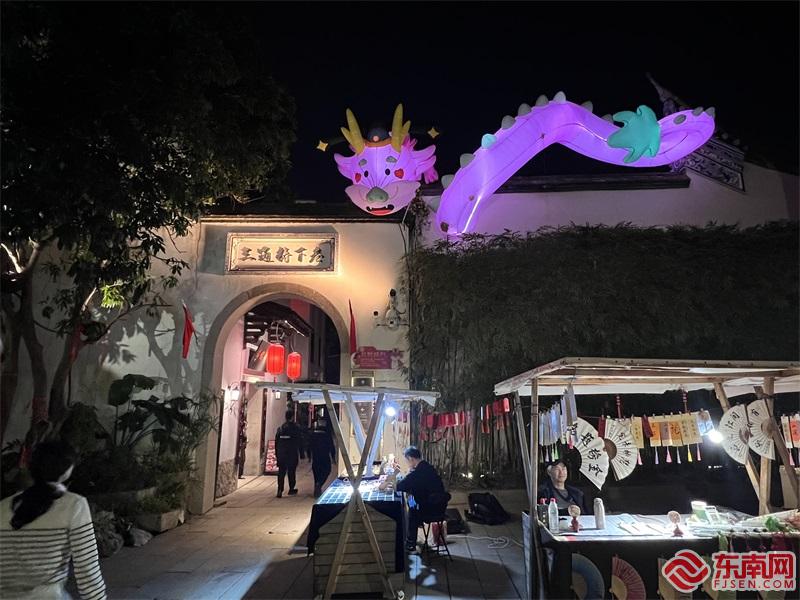 而在河對岸的上下杭步行街,則是另一番景象。不同于倉前公園“龍鳳呈祥”燈組的璀璨奪目,這里藏身于坊巷間的龍狀花燈,佐以波光粼粼的小河景觀,古色古香的建筑以及悠揚的歌謠,給人一種靜謐幽適的感受。