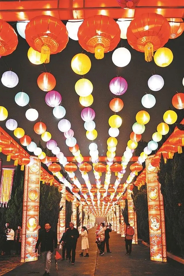 在牛崗山公園,數(shù)千盞造型多樣的燈籠裝點(diǎn)著蔥翠的園景。公園燈光布景共分為5個(gè)區(qū)域,以福文化為主調(diào),將中國(guó)傳統(tǒng)文化和園林景觀完美融合,營(yíng)造了喜慶的節(jié)日氛圍。