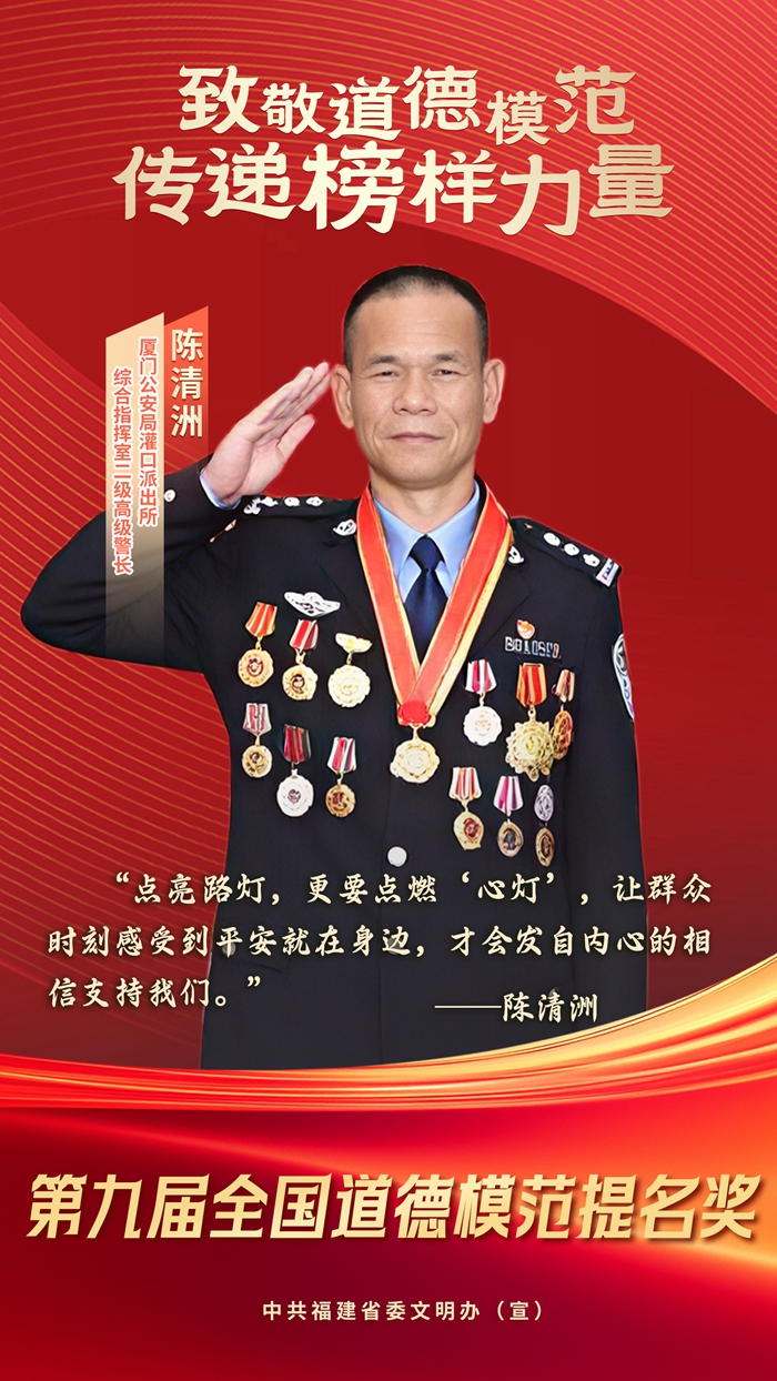 陳清洲,男,漢族,1970年12月生,中共黨員,廈門市公安局灌口派出所綜合指揮室二級高級警長,第九屆全國敬業奉獻道德模范提名獎獲得者。他始終保持忠誠警魂,堅持匠心耕耘,一心為民,為廣大群眾辦了大量的好事實事。他是百姓心中的“亮燈警察”,是同事眼中的“拼命三郎”,是網民粉絲的“好警蜀黍”,是古道熱腸的“調解達人”,是廈門警隊的“榜樣人物”。即使被確診為肝癌晚期,他依然心系工作,在平凡的工作崗位上鑄就了“人民公安為人民”的精神高地和道德豐碑。