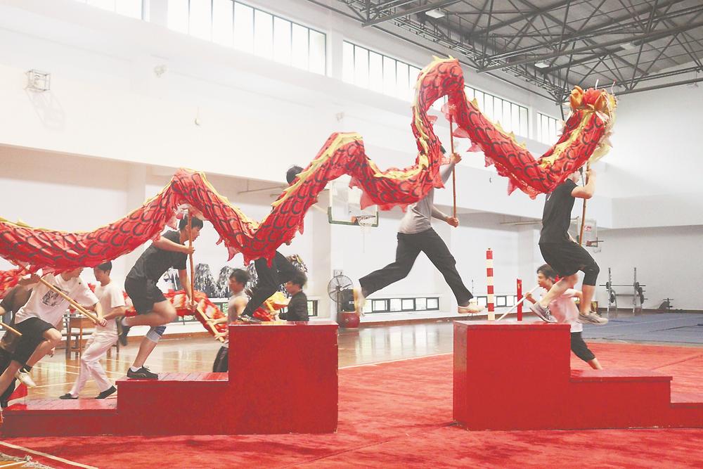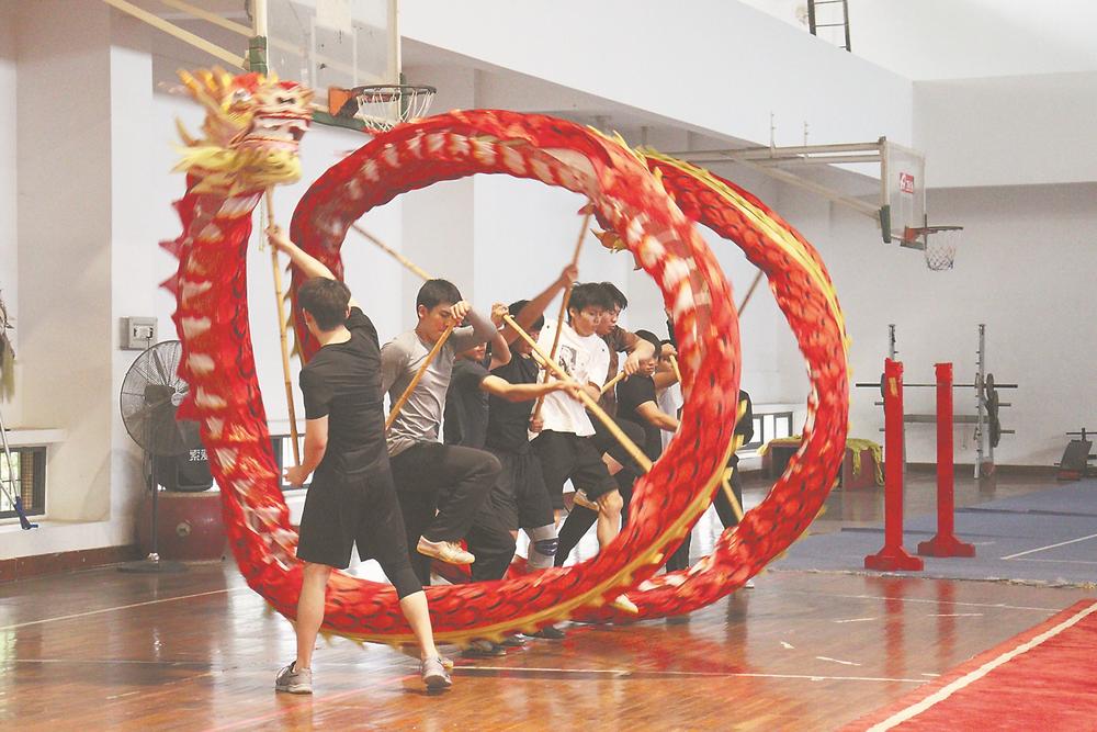 集美大學體育館內,舞龍隊隊員訓練揮汗如雨。